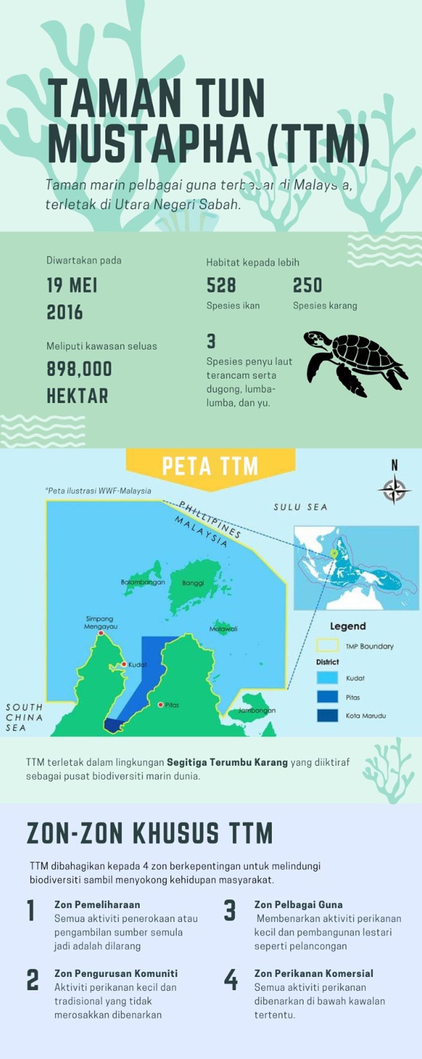 Terletak dalam lingkungan Segitiga Terumbu Karang yang diiktiraf sebagai pusat biodiversiti marin dunia, TTM merupakan habitat kepada lebih 500 spesies ikan, 250 spesies karang, penyu laut dan dugong yang terancam, serta hutan hujan primer, bakau, dan rumput laut yang signifikan. Kepentingan sosio-ekonomi kawasan ini tidak boleh diabaikan, dengan lebih 80,000 penduduk pesisir bergantung pada sumber lautnya untuk kelangsungan hidup dan pendapatan harian.