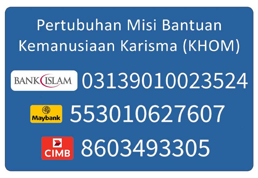Orang ramai yang ingin menghulurkan bantuan, boleh menyalurkan sumbangan melalui akaun-akaun berikut atas nama Pertubuhan Misi Bantuan Kemanusiaan Karisma (KHOM) - Bank Islam (03139010023524), Maybank (553010627607) atau CIMB (8603493305).